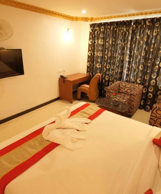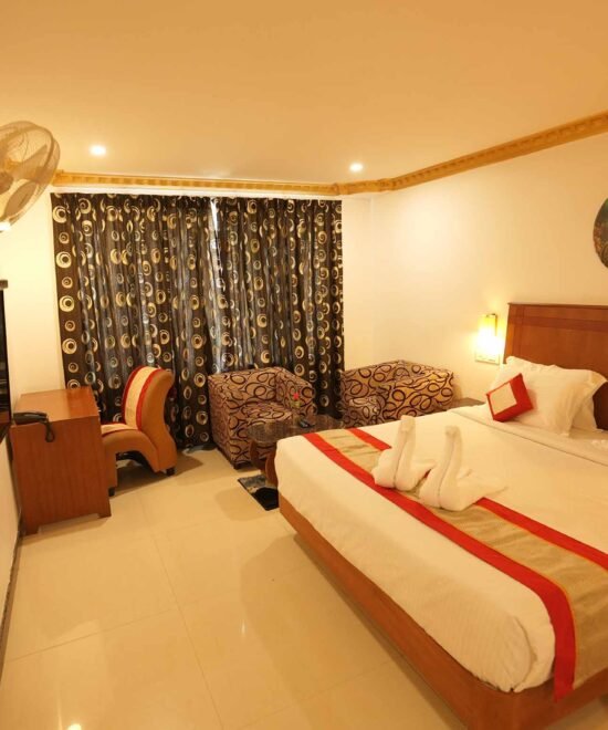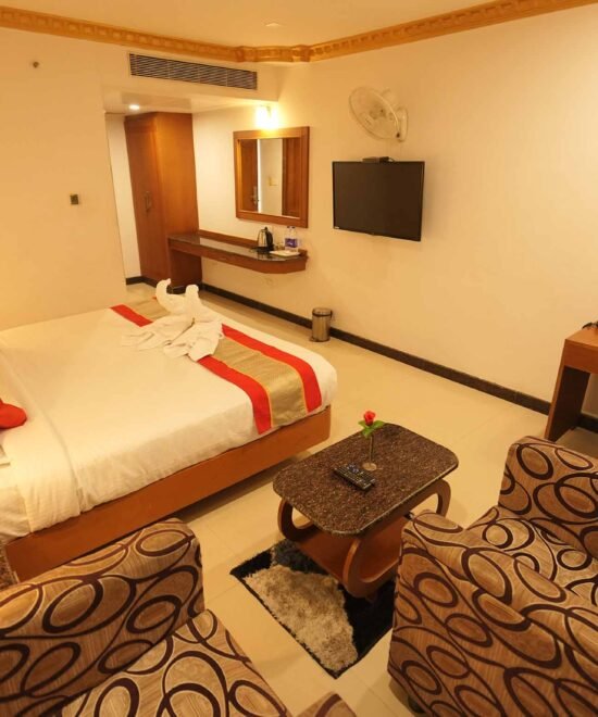 Designed for business travelers and short stays, our Executive Rooms offer a well-planned 225 sq. ft. space featuring a comfortable King Size Bed, attached bathroom, and a cozy seating area with two sofas. A reading table with chair, tea pot table, wardrobe with hangers, and powder table with mirror ensure convenience throughout your stay.